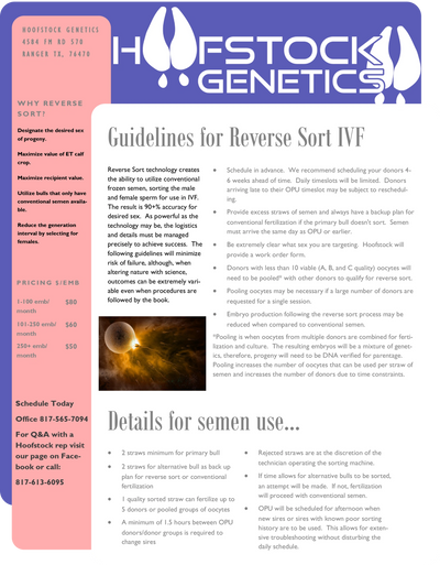 This technology creates the ability to utilize conventional frozen semen to produce gender specific IVF embryos. The result is 90+% accuracy for the desired sex of your progeny. In order to achieve the highest rate of success, logistics and details must be precisely managed. This is why we put together a detailed list of guidelines to ensure peak results. You can download a copy of the Guidelines for Reverse Sort at the bottom of the page.